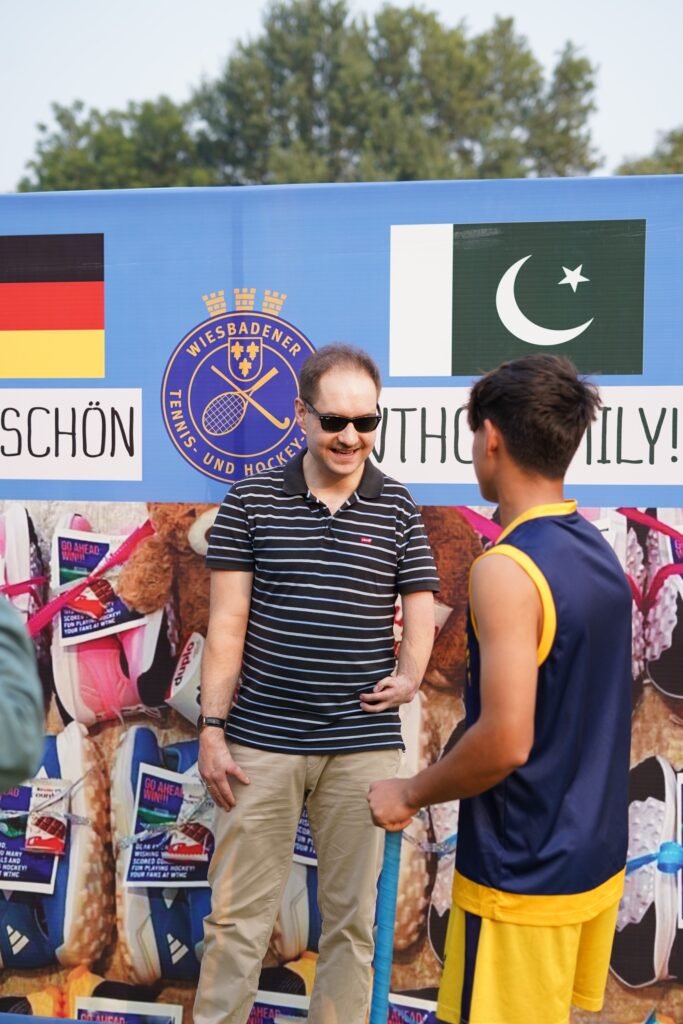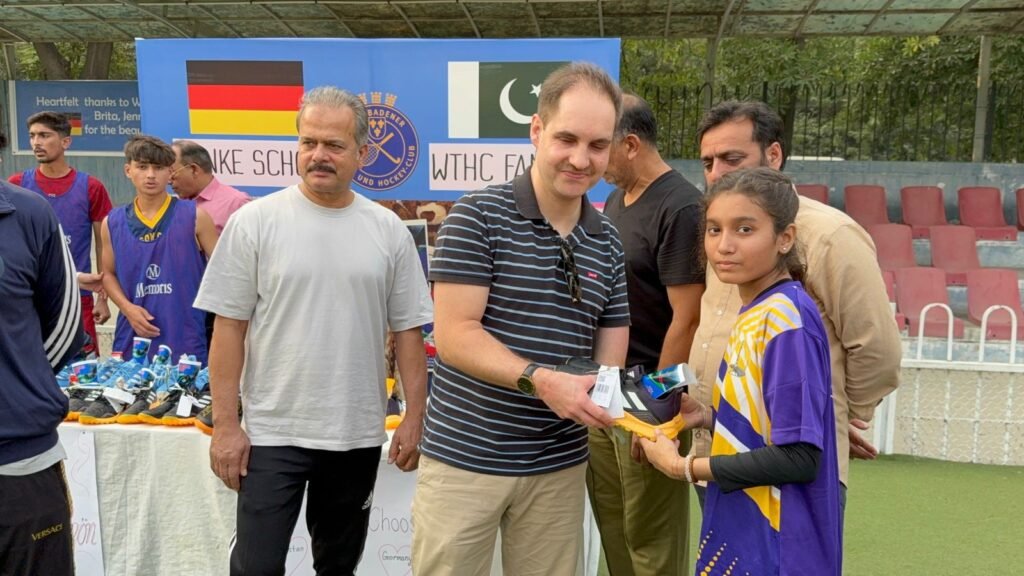 The German Embassy in Pakistan’s Cultural Attaché, Jan Gerald, paid a visit to the Khawaja Junaid Hockey Academy in Lahore, where he distributed shoes among young players. The ceremony took place at the National Hockey Stadium’s turf, with Jan Gerald as the chief guest. During the event, he handed out shoes and chocolates to the boys and girls, and also presented school bags to two students.